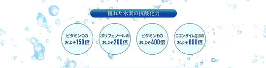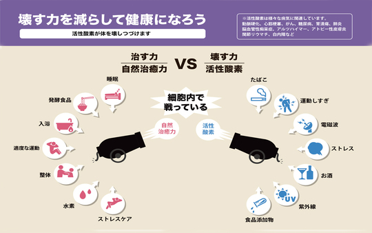 身体の「善玉活性酸素」とは反応せず、酸化力の強い「悪玉活性酸素」だけと結びつき、分解して無害な水にして尿や汗で体外に放出させます。「悪玉活性酸素」を除去することで、がんを含めた生活習慣病になりにくい身体作りや、がん治療による副作用の軽減、運動後の疲労軽減、美肌効果にもつながります