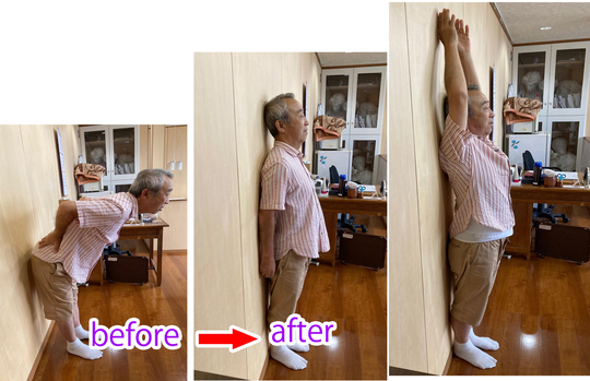 写真のように施術前、腰を伸ばすことが出来ませんでしたが、施術の痛みもなく、一度の施術で腰を伸ばすのが怖かったのですが、すんなりと腰を伸ばせたことに感激しました。