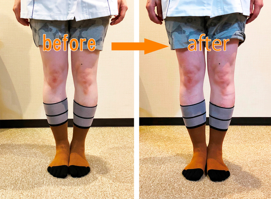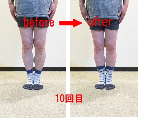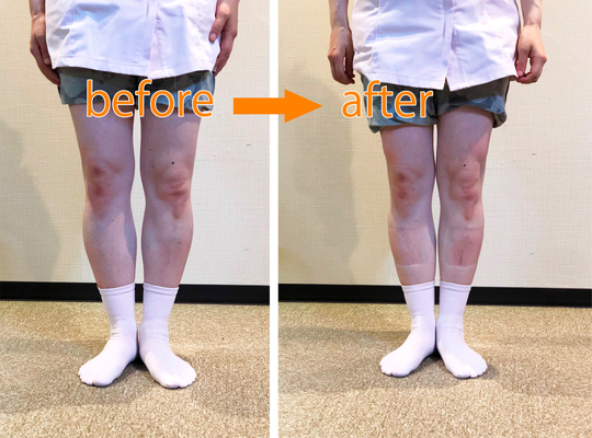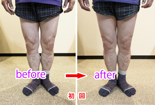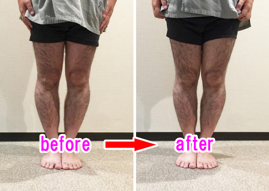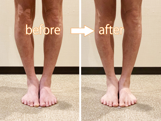 この状態も捻じれが強く、場合によっては普通のO脚で足がかなり離れている方の方が早く改善する場合もあります。またこの足の方は足自体の柔軟性が無くなっている人も多くそれもなかなか良くならない原因の一つになっています。