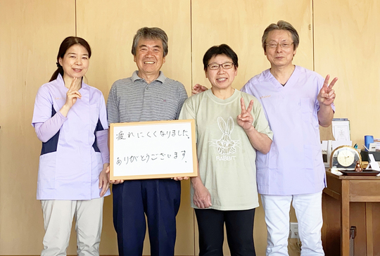 渋沢すずらん整体院がスーパー銭湯から現在のご自宅に移動してからはそちらに通うようになり、帰宅すると足の甲のむくんだ痛みが消えてごきげんな私の姿を見ていた妻も通うようになり今では夫婦で同時に施術を受けて、その帰りに買い物や癒やしのひとときがすごせてとても感謝しています。